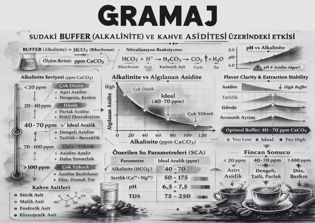 Kahve ekstraksiyonu sırasında su, kahve çekirdeğinde bulunan organik asitleri (başlıca sitrik asit, malik asit, fosforik asit, asetik asit ve klorojenik asit türevleri) çözerek sıvı faza taşır. Sudaki bikarbonat iyonları bu asitlerle reaksiyona girerek onları kısmen nötralize eder. Bu tamponlama etkisi, kahvenin algılanan asidite seviyesini doğrudan etkiler. Yüksek alkalinite seviyesine sahip sular, asidik bileşenleri daha fazla nötralize ederek algılanan asiditeyi azaltır, bu da fincanda daha düşük parlaklık, azalmış kompleksite ve daha “düz” bir tat profili oluşturur. Ayrıca aşırı buffer kapasitesi, kahvenin aromatik ayrımını azaltarak tatların bulanıklaşmasına neden olabilir.